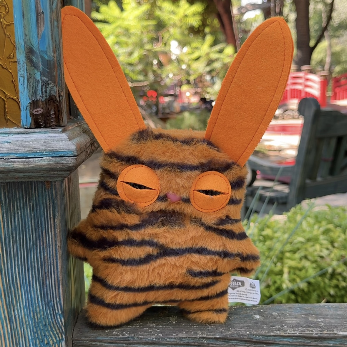 Пухнастий тигрик з довгими вухами. Його заплющені очі та тигровий окрас створюють затишний образ. Готовий до пригод та солодкого сну.